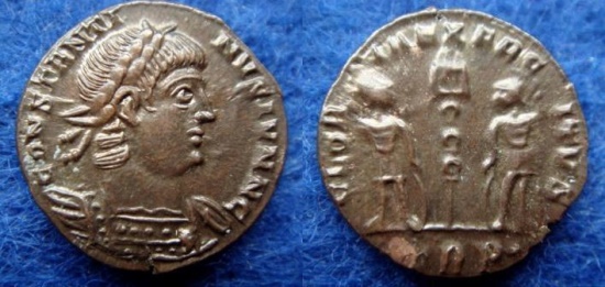 Constantine II. As Caesar, AD 316-337. Æ Follis (2,16g). Treveri (Trier) mint, 2nd officina. Struck AD 335-337. Laureate and cuirassed bust right / Standard between two soldiers, each holding spear and shield; TRP. RIC 586. EF.