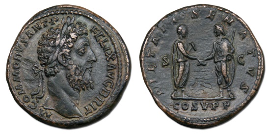 Commodus AE Sestertius, Rome, AD 186-189; (32 mm, 27,80 g) M COMMODVS ANT • P FELIX AVG BRIT, laureate head right. PIETATI SENATVS, Commodus standing right and senator (or Genius of the Senate) standing left clasping hands; in field, S - C; in ex. COS V P P. RIC 549; C 410. Scarce. Bold portrait, dark patina and large flan. Minor scratches, about extremely fine. This is an interesting historical type, as it commemorates Commodus' bestowal of the title Pater Senatus by the senate. It is ironic, considering the animosity and contempt between the emperor and the senate at the time. |