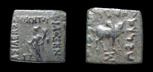Kings of Bactria, Philoxenos. c.110 - 95 BC. AE Square Unit. 20x19mm. Pushkalavati Mint. 6.78g. Bilingual Series. Demeter standing lt., with corn-ears and a cornucopiae. / Humped bull standing rt. Bopearachchi Series 10H; SNG ANS 1209; Mitchiner 2, p. 202, Type 344e. VF and scarce.