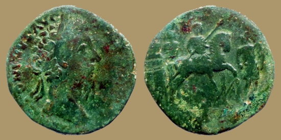Marcus Aurelius Æ Sestertius. Rome, AD 169-170 29 mm - 24.27 g M ANTONINVS AVG TR P XXIIII Laureate head right R/ COS III, Aurelius, wearing cuirass, on horse right, holding spear; in front, soldier with spear and shield, three soldiers holding standards behind, PROFECTIO AVG S C in exergue. C.202 (25 frcs); RIC 977 green brown patina, n.VF, rare Fine. Rare. |