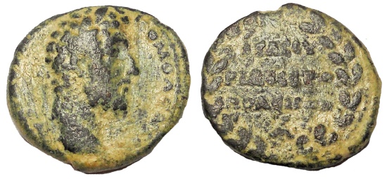 Syria, Hieropolis, Commodus. 177-192 AD. AE 23 mm. 8.9 gm Obv: AV KOMOΔOC EVTVX. Laureate head of Commodus r. Rev: ΘΕΑC CY/ PIAC IEPO/ ΠΟΛΕΙΤΩΝ/ A in 4 lines within wreath. Rare.