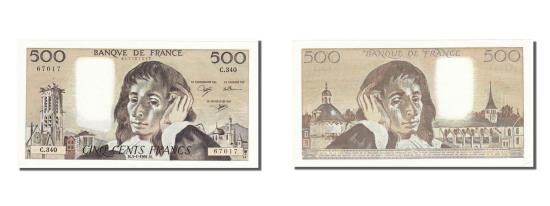 | | Banknote, France, 500 Francs, 500 F 1968-1993 ''Pascal'', 1991, 1991-01-03 | | | Signature D. Bruneel, B. Dentaud and A. Charriau. 5.7.1990-2.5.1991., Tower of St. Jacques in Paris at left, Blaise Pascal at center., Blaise Pascal at left, abbey of Port Royal., Yellow-brown and dark brown. | | FEATURES |