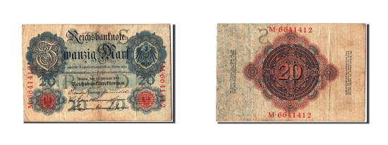 | | Banknote, Germany, 20 Mark, 1914, 1914-02-19, VF(30-35) | | | 7 digit serial #., Eagle at upper right., Blue., Red and blue. | | FEATURES |