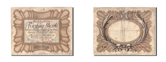 | | Banknote, Germany, 50 Mark, 1918, 1918-11-30, F(12-15) | | | Broad margin, with egg-shaped white area (known as the "Egg Note")., Olive-brown on gray underprint. | | FEATURES |