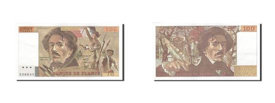 | | Banknote, France, 100 Francs, 1978, 1982, UNC(63), Fayette:69.6, KM:154b | | | Signature P. A. Strohl, J. J. Tronche and B. Dentaud. 1979-86., Eug<e>ne Delacroix at left center. Marianne holding tricolor, park of Delacroix's painting La Liberté Guident le Peuple at right. Like #153 but 100 CENT FRANCS retouched with heavier diagonal lines at upper left., Delacroix at right holding quill pen., Brown. | | FEATURES |