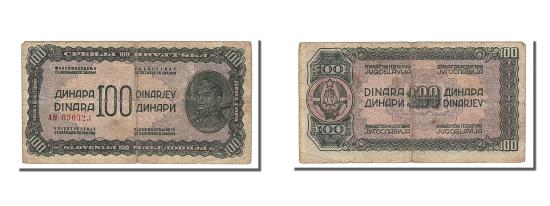 | | Banknote, Yugoslavia, 100 Dinara, 1944, VF(30-35) | | | Like #52a., Soldier with rifle at right., Arms with date 29.X1.1943 at left., Dark green on gray and lilac underprint. | | FEATURES |