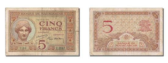 | | Banknote, Madagascar, 5 Francs, EF(40-45) | | | Goddess Juno at left. 2 signature varieties., Red-brown on blue and green underprint. | | FEATURES |