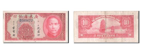 | | Banknote, China, 10 Cents, 1935, AU(50-53) | | | Without place name. (S/M #K56-30a)., SYS at right., Junk (sampan) in harbor at center., Red on multicolor underprint. | | FEATURES |