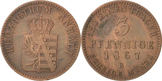 | | Coin, German States, ANHALT-BERNBURG, Alexander Carl, 3 Pfennige, 1867 | | | Crowned arms, Denomination, date, HERZOGTHUM ANHALT | | FEATURES |