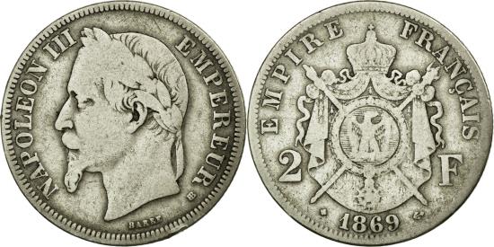 | | Coin, France, Napoleon III, Napoléon III, 2 Francs, 1869, Strasbourg | | | Napoléon III, Laureate head left, Crowned and mantled arms divide denomination | | FEATURES |