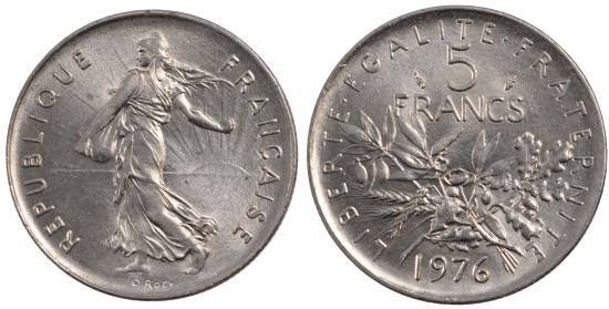 | | Coin, France, Semeuse, 5 Francs, 1976, , Nickel Clad Copper-Nickel | | | Semeuse, The Seed Sower, Branches divide denomination and date | | FEATURES |