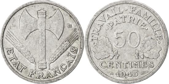 | | Coin, France, Bazor, 50 Centimes, 1943, , Aluminum, KM:914.1 | | | Bazor, Double bit axe, grain sprigs flank, Denomination above date, oak leaves flank | | FEATURES |