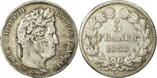 | | Coin, France, Louis-Philippe, 5 Francs, 1838, Lille, , Silver | | | Louis-Philippe, Laureate head right, Mint marks at edge outside wreath | | FEATURES |