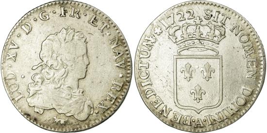 | | Coin, France, Louis XV, 1/3 Écu de France, 1/3 Ecu, 1722, Paris, | | | 1/3 Écu de France, Young laureate bust right, Crowned arms of France, LUD <Bullet> XV <Bullet> D <Bullet> G <Bullet> FR <Bullet> ET <Bullet> NAV <Bullet> REX <Bullet> | | FEATURES |