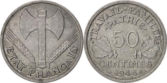 | | Coin, France, Bazor, 50 Centimes, 1944, Beaumont le Roger, , Aluminum | | | Bazor, Grain sprigs flank double bit axe, Denomination above date, oak leaves flank | | FEATURES |