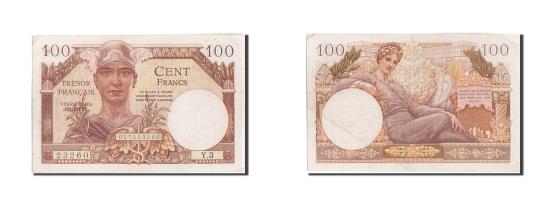 | | France, 100 Francs, 1955-1963 Treasury, 1955, Y.3, AU(55-58), KM:M11a | | | Issued note., Mercury at center., Reclining woman. | | FEATURES |