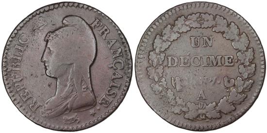 | | Coin, France, Dupré, Decime, 1798, Paris, , Bronze, Gadoury:187 | | | Dupré, Liberty head left, Value within oak wreath, REPUBLIQUE FRANCAISE <Bullet> * | | FEATURES |