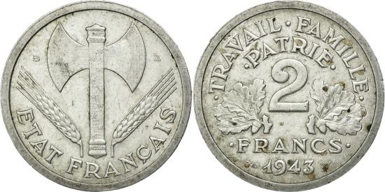 | | Coin, France, Bazor, 2 Francs, 1943, Beaumont le Roger, , Aluminum | | | Bazor, Grain sprigs flank double bit axe, Oak leaves flank denomination, date below | | FEATURES |