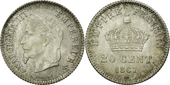 | | Coin, France, Napoleon III, Napoléon III, 20 Centimes, 1867, Strasbourg | | | Napoléon III, Laureate head left, Crown above denomination | | FEATURES |