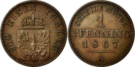 | | Coin, German States, PRUSSIA, Wilhelm I, Pfennig, 1867, Berlin, | | | Crowned shield of eagle arms, FR monogram on breast, 3-line inscription with date, mintmark in exergue, Ref. N-19., 360 EINEN THALER | | FEATURES |