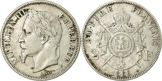 | | Coin, France, Napoleon III, Napoléon III, 2 Francs, 1866, Strasbourg | | | Napoléon III, Laureate head left, Crowned and mantled arms divide denomination | | FEATURES |