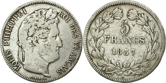 | | Coin, France, Louis-Philippe, 5 Francs, 1837, Bordeaux, , Silver | | | Louis-Philippe, Laureate head right, Mint marks at edge outside wreath | | FEATURES |