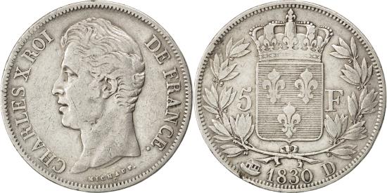 | | Coin, France, Charles X, 5 Francs, 1830, Lyon, , Silver, KM:728.4 | | | Charles X, Type II, Crowned arms divide denomination within wreath | | FEATURES |
