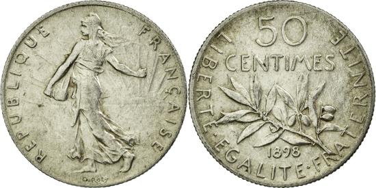 | | Coin, France, Semeuse, 50 Centimes, 1898, Paris, , Silver, KM:854 | | | Semeuse, Figure sowing seed, Leafy branch divides date and denomination | | FEATURES |