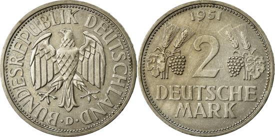 | | Coin, GERMANY - FEDERAL REPUBLIC, 2 Mark, 1951, Munich, | | | Eagle, Denomination flanked by leaves, grapes, and grain sprigs, date above | | FEATURES |