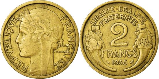 | | Coin, France, Morlon, 2 Francs, 1935, , Aluminum-Bronze, KM:886 | | | Morlon, Laureate head left, Denomination and date flanked by cornucopias | | FEATURES |