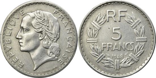 | | Coin, France, Lavrillier, 5 Francs, 1948, Beaumont le Roger, | | | Lavrillier, Laureate head left, Denomination above date within sectioned wreath | | FEATURES |