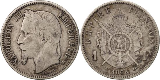 | | Coin, France, Napoleon III, Napoléon III, Franc, 1868, Strasbourg, | | | Napoléon III, Laureate head left, Crowned and mantled arms divide denomination, Rare variety with large BB | | FEATURES |