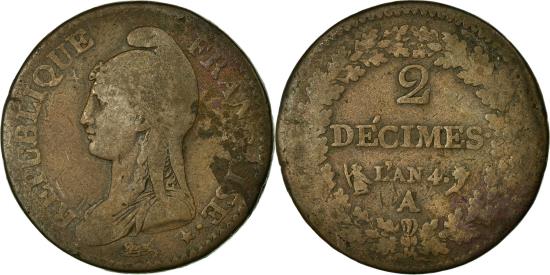 | | Coin, France, Dupré, 2 Décimes, 1795, , Bronze, KM:638.1, Gadoury:300 | | | Dupré, Liberty head left, Value within oak wreath, REPUBLIQUE FRANCAISE <Bullet> * | | FEATURES |