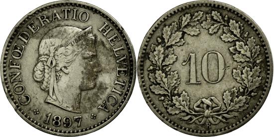 | | Coin, Switzerland, 10 Rappen, 1897, Bern, , Copper-nickel, KM:27 | | | Crowned head right, Value within wreath, CONFOEDERATIO HELVETICA,Karl Schwenzer | | FEATURES |