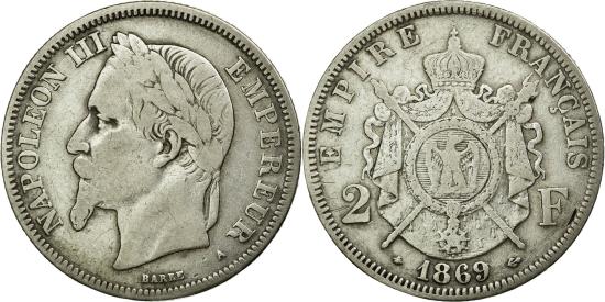 | | Coin, France, Napoleon III, Napoléon III, 2 Francs, 1869, Paris, | | | Napoléon III, Laureate head left, Crowned and mantled arms divide denomination, NAPOLEON III EMPEREUR | | FEATURES |