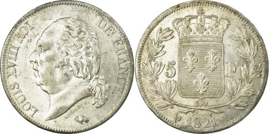 | | Coin, France, Louis XVIII, Louis XVIII, 5 Francs, 1821, Paris, | | | Louis XVIII, Head left, Crowned arms divide denomination within wreath, LOUIS XVII ROI DE FRANCE. | | FEATURES |