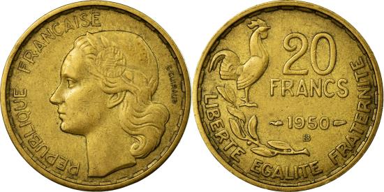 | | Coin, France, Guiraud, 20 Francs, 1950, Beaumont le Roger, | | | Guiraud, G. GUIRAUD behind head, Rooster above laurel sprig, denomination at right | | FEATURES |