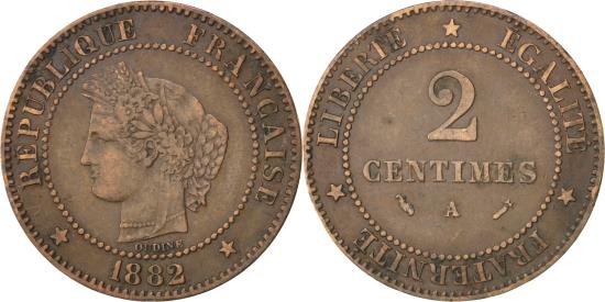 | | Coin, France, Cérès, 2 Centimes, 1882, Paris, , Bronze, KM:827.1 | | | Cérès, Laureate head left, Denomination | | FEATURES |