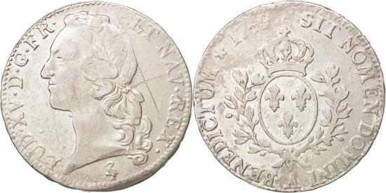 | | Coin, France, Louis XV, Écu au bandeau, Ecu, 1759, Paris, , Silver | | | Écu au bandeau, Head with headband left, Crowned round arms of France within sprays, Dav. #1331., LUD <Bullet> XV <Bullet> D <Bullet> G <Bullet> FR <Bullet> ET NAV <Bullet> REX | | FEATURES |