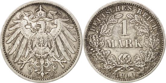 | | Coin, GERMANY - EMPIRE, Wilhelm II, Mark, 1909, Munich, , Silver, KM:14 | | | Denomination within wreath, Crowned imperial eagle with shield on breast, Struck from 1890-1916. | | FEATURES |