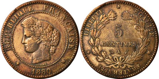 | | Coin, France, Cérès, 5 Centimes, 1880, Paris, , Bronze, KM:821.1 | | | Cérès, Laureate head left, Denomination within wreath | | FEATURES |