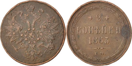 | | Coin, Russia, 2 Kopeks, 1863, Ekaterinbourg, , Brass, KM:127a | | | National arms, Value and date within sprays | | FEATURES |