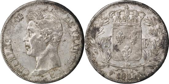 | | Coin, France, Charles X, 5 Francs, 1825, Lille, , Silver, KM:720.13 | | | Charles X, Type I, Crowned arms divide denomination within wreath | | FEATURES |