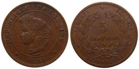 | | Coin, France, Cérès, 5 Centimes, 1884, Paris, , Bronze, KM:821.1 | | | Cérès, Laureate head left, Denomination within wreath | | FEATURES |
