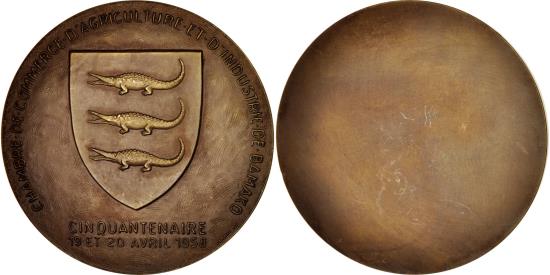 | | France, Medal, Mali, Chambre de Commerce d'Agriculture et d'Industrie de Bamako | | | Coat of arms made of three crocodiles, CHAMBRE . DE . COMMERCE D'AGRICULTURE . ET . D'INDUSTRIE . DE . BAMAKO // CINQUANTENAIRE / 19 ET 20 AVRIL 1958 | | FEATURES |