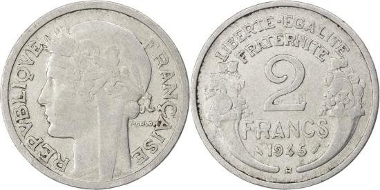 | | Coin, France, Morlon, 2 Francs, 1945, Beaumont le Roger, , Aluminum | | | Morlon, Laureate head left, Denomination and date flanked by cornucopias | | FEATURES |