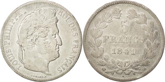 | | Coin, France, Louis-Philippe, 5 Francs, 1841, Strasbourg, , Silver | | | Louis-Philippe, Laureate head right, Mint marks at edge outside wreath | | FEATURES |