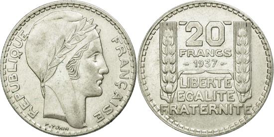 | | Coin, France, Turin, 20 Francs, 1937, Paris, , Silver, KM:879 | | | Turin, Laureate head right, long and short leaves, Denomination above date, inscription below, grain columns flank, Without mint mark. | | FEATURES |