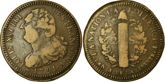 | | Coin, France, 2 sols françois, 2 Sols, 1791, Paris, , Bronze | | | 2 sols françois, Bust left, Liberty cap above fasces, oak wreath in background, LOUIS XVI ROI DES FRANCOIS <Bullet> | | FEATURES |