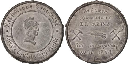 | | France, Medal, Ville de Reims, Ateliers communaux, History, 1848, , Tin | | | head right, Tools, RÉPUBLIQUE FRANÇAISE * LIBERTÉ ÉGALITÉ FRATERNITÉ *, ATELIERS / COMMUNAUX / DE REIMS / 3511 INSCRIPTIONS / AVRIL 1848 | | FEATURES |